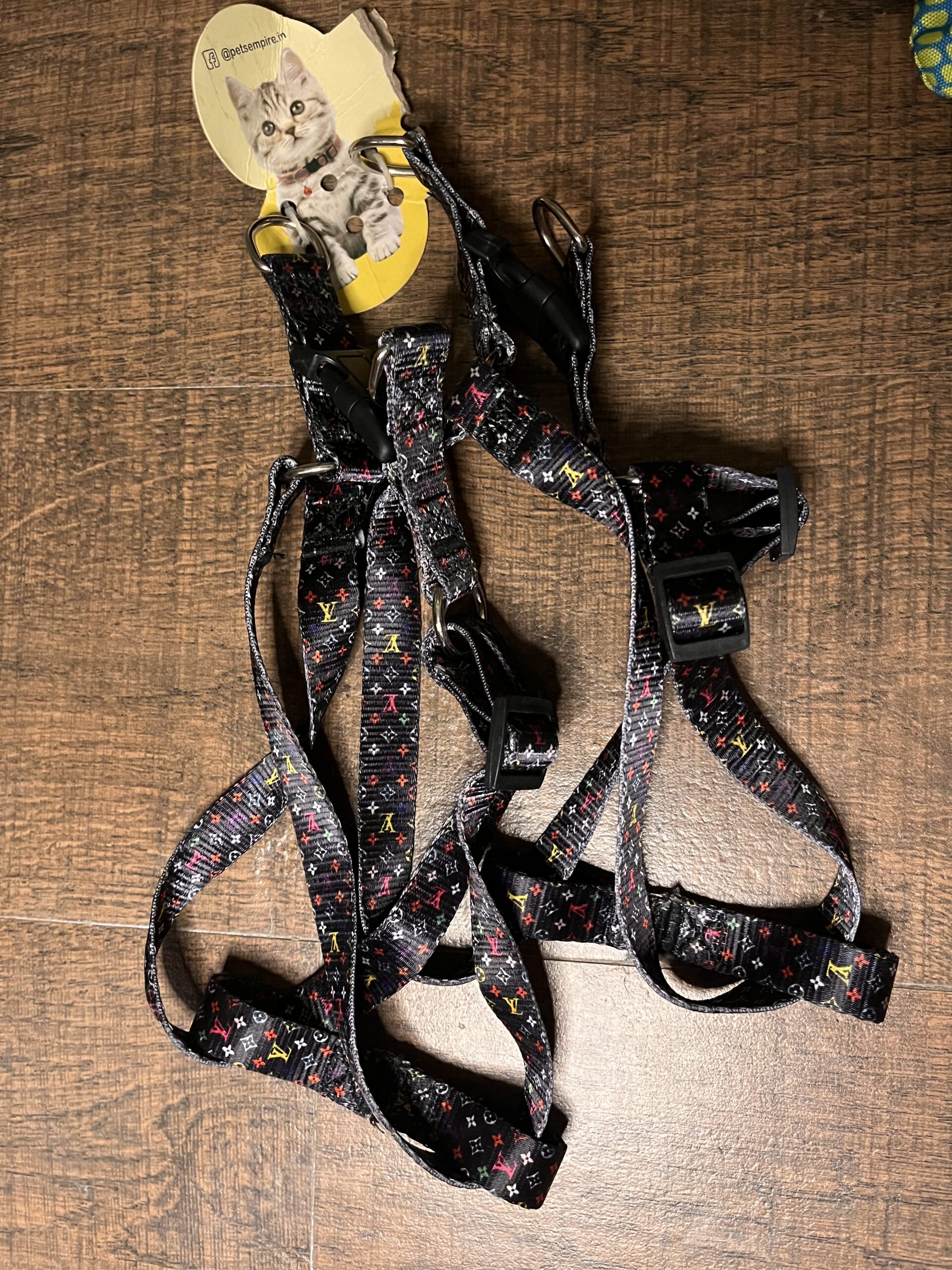 Stylish and durable dog harness with matching leash, designed for small breed dogs. Adjustable straps ensure a secure and comfortable fit for daily walks.