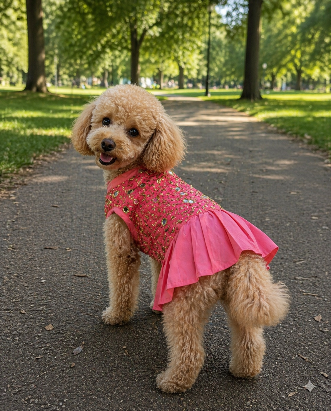 Elegant pink pet frock with embellished detailing, breathable fabric, and easy velcro closure. Perfect for parties and special occasions.