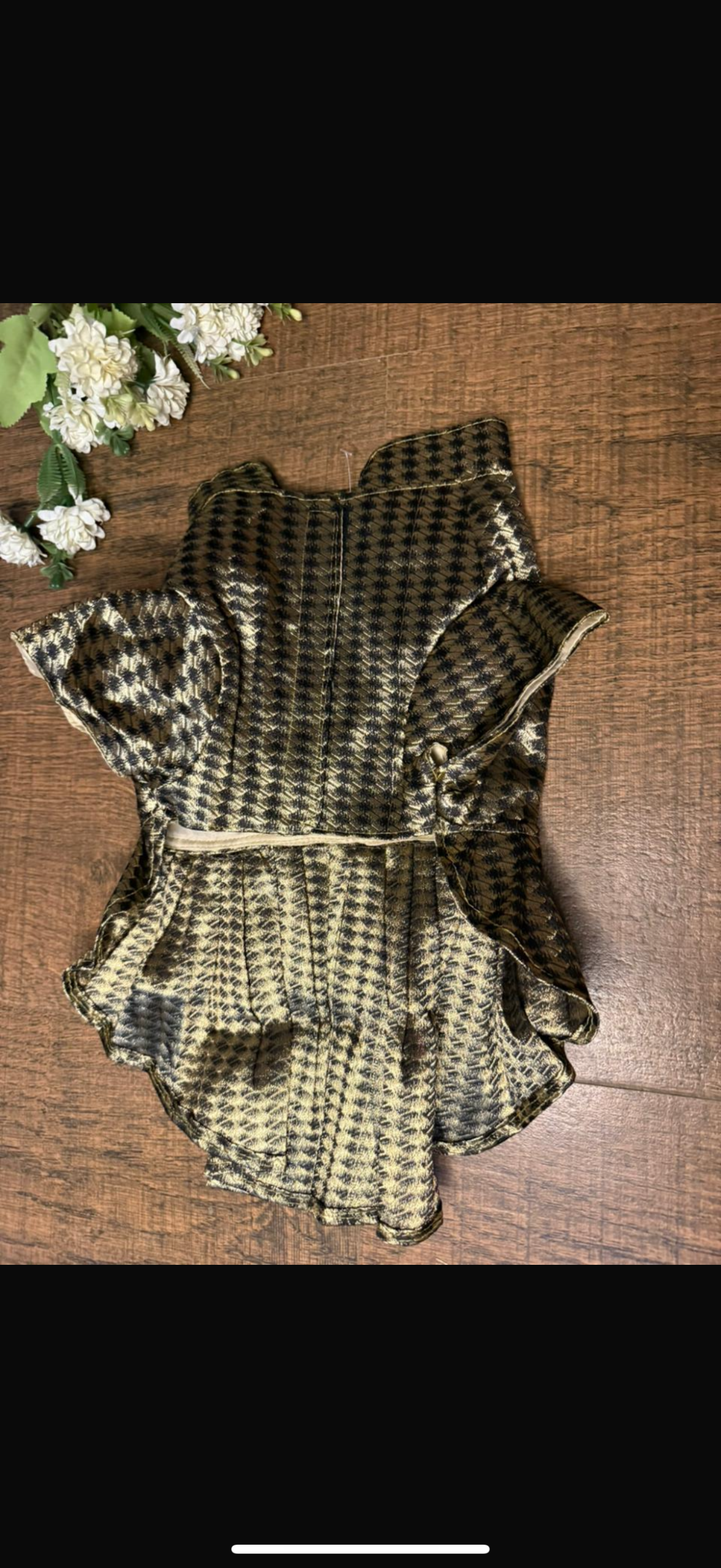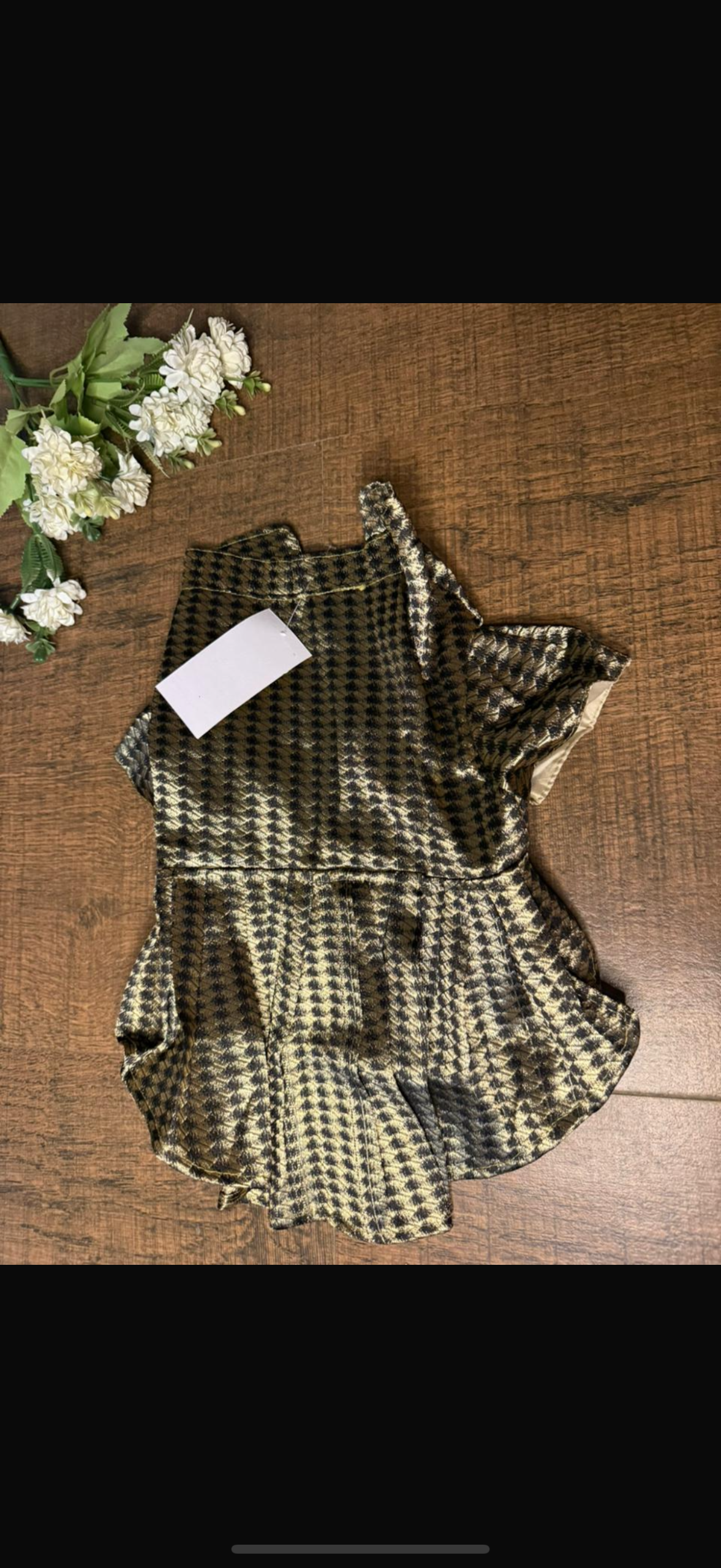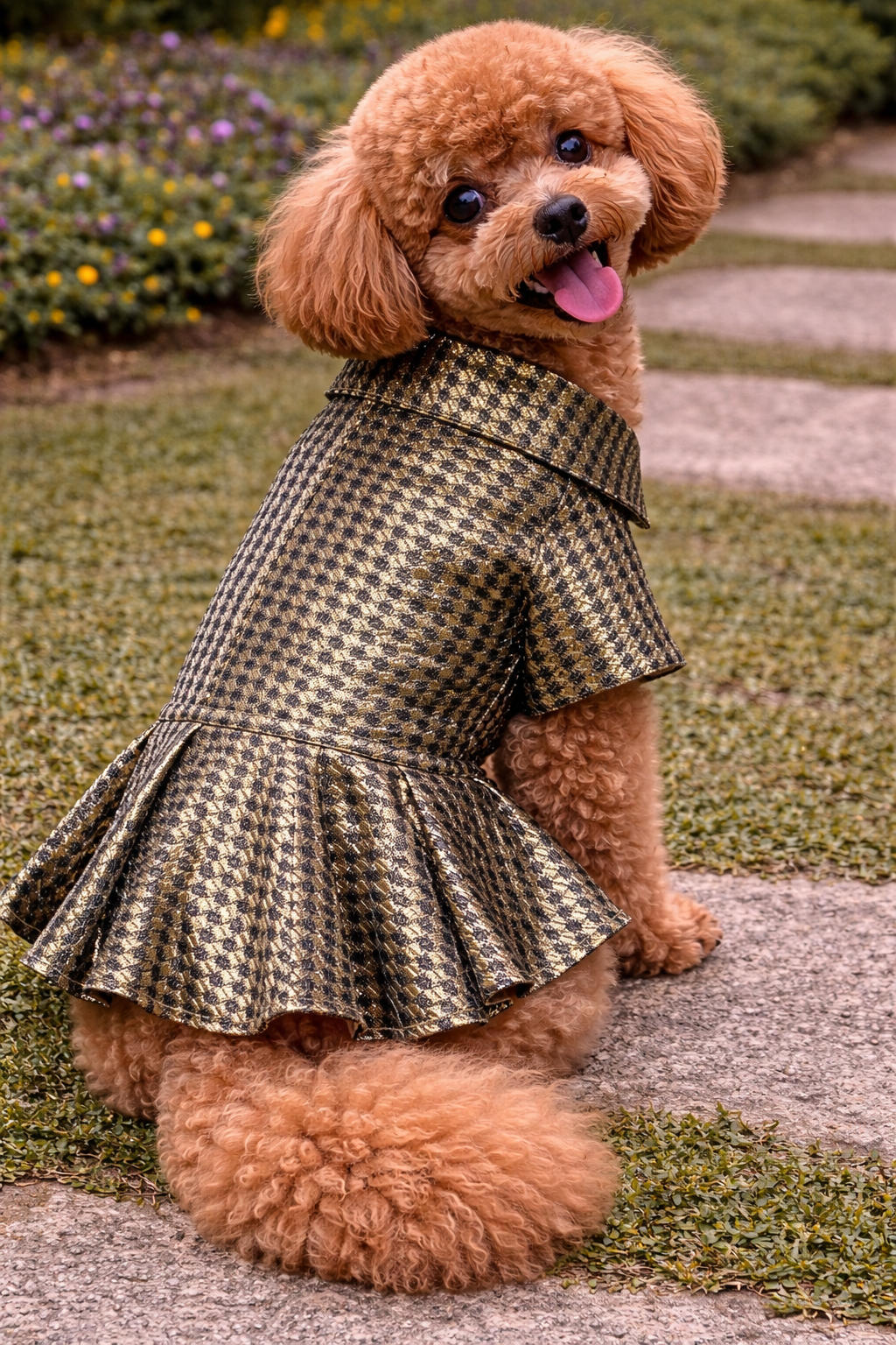 Dress your pet in elegance with this stunning festive designer frock. Featuring a rich gold and black houndstooth pattern, this outfit is perfect for special occasions, celebrations, and festive gatherings.