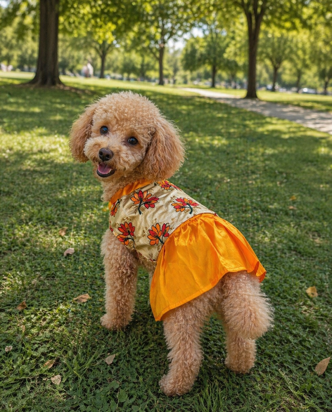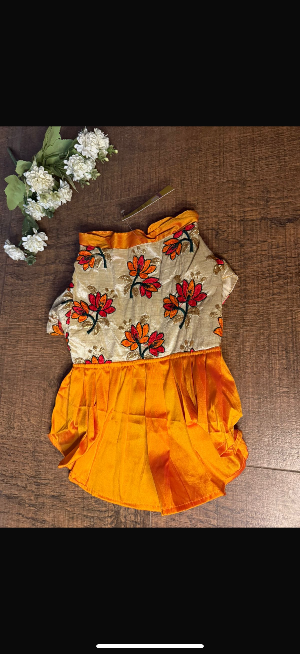 Add a touch of elegance to your pet’s festive wardrobe with this beautifully designed floral frock. Featuring a rich golden bodice with vibrant floral patterns and a flowing orange pleated skirt, this outfit is perfect for celebrations and special occasions.