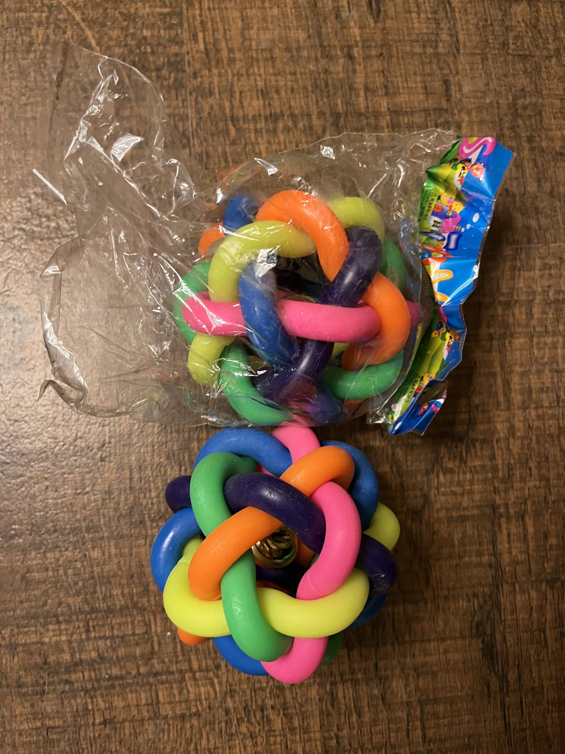 Keep your furry friend entertained with this Rainbow Rubber Knot Ball Dog Toy with Bell. Designed with colorful interlinked rubber rings and a jingling bell inside, this toy encourages interactive play, mental stimulation, and exercise.