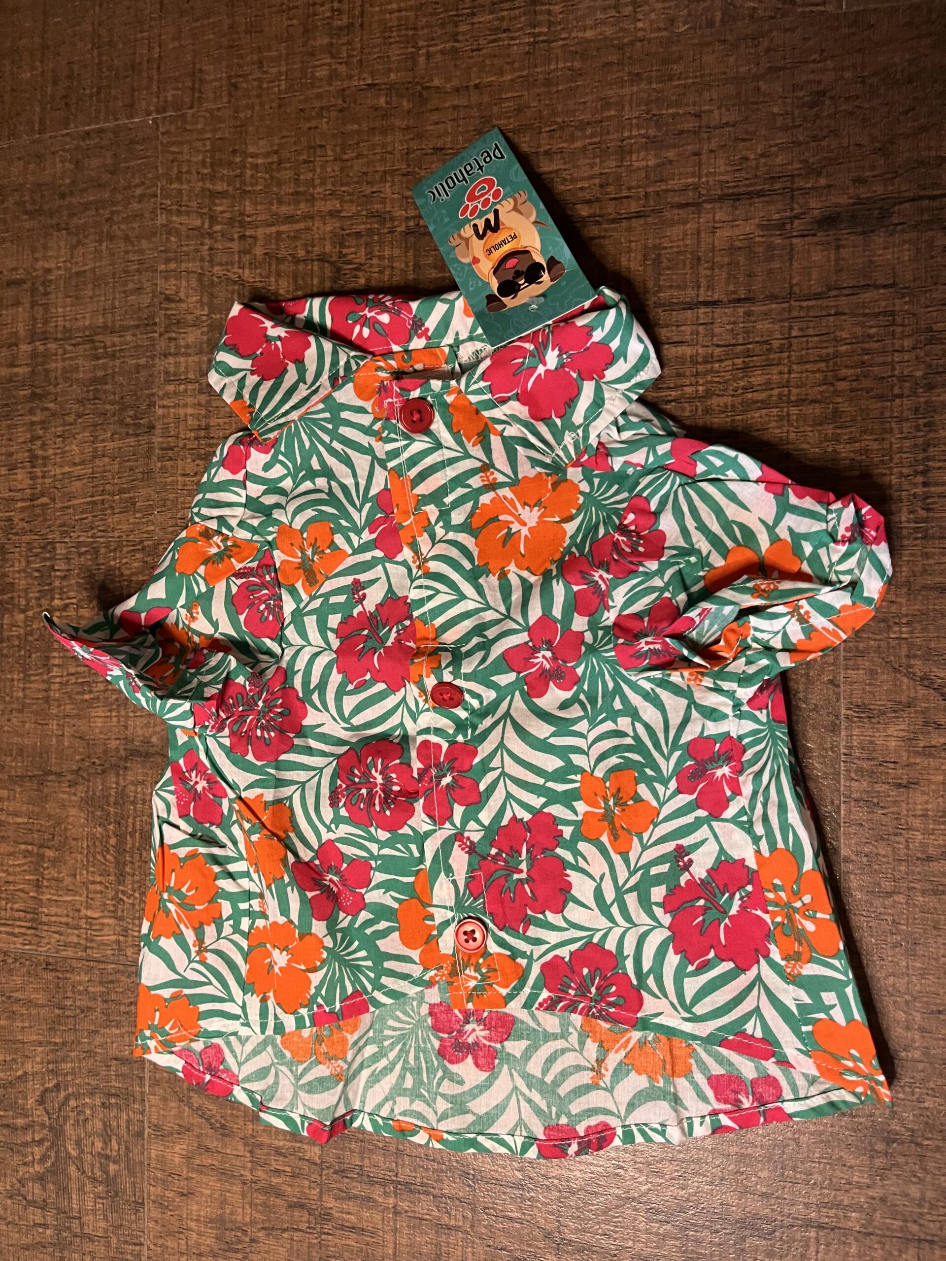 Stylish tropical cotton pet shirt with breathable fabric and easy velcro closure. Features a vibrant floral print and decorative buttons for a smart look.